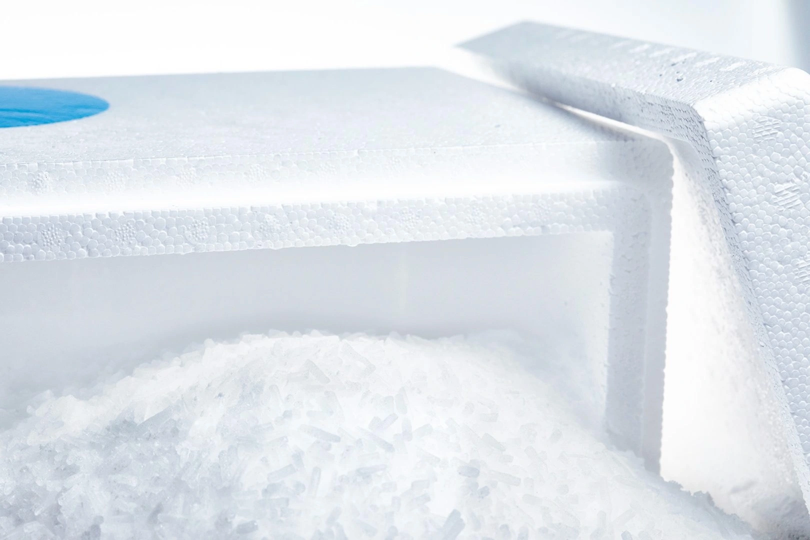 Freshly produced dry ice pellets in a high-quality polystyrene thermobox